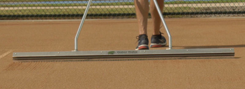 Ziehen Sie den Stahlrechen hinter sich her wie einen Abziehbesen und rauhen Sie die verhärteten Bereiche des Tennisplatzes auf.